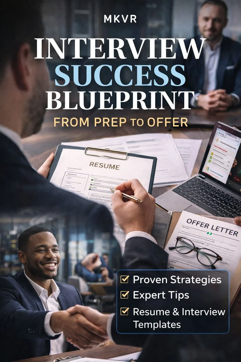 Premium magazine-style book cover for ‘Interview Success Blueprint: From Prep to Offer’ by MKVR, showing a realistic job interview scene with a candidate reviewing a resume, handshake, offer letter, laptop, and professional office environment — representing interview preparation, career success, and job offer guidance.Interview Success Blueprint: From Prep to Offer