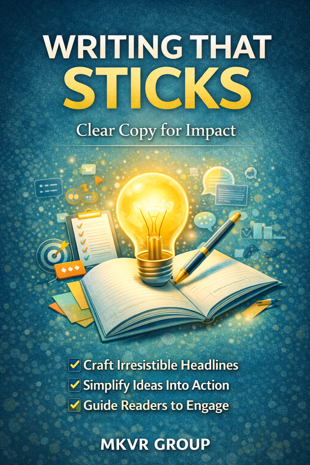 Realistic ebook cover showing a professional writer working at a desk with a notebook, pen, and laptop, creating persuasive copy and headline concepts — Writing That Sticks by MKVR Group.Writing That Sticks: Clear Copy for Impact